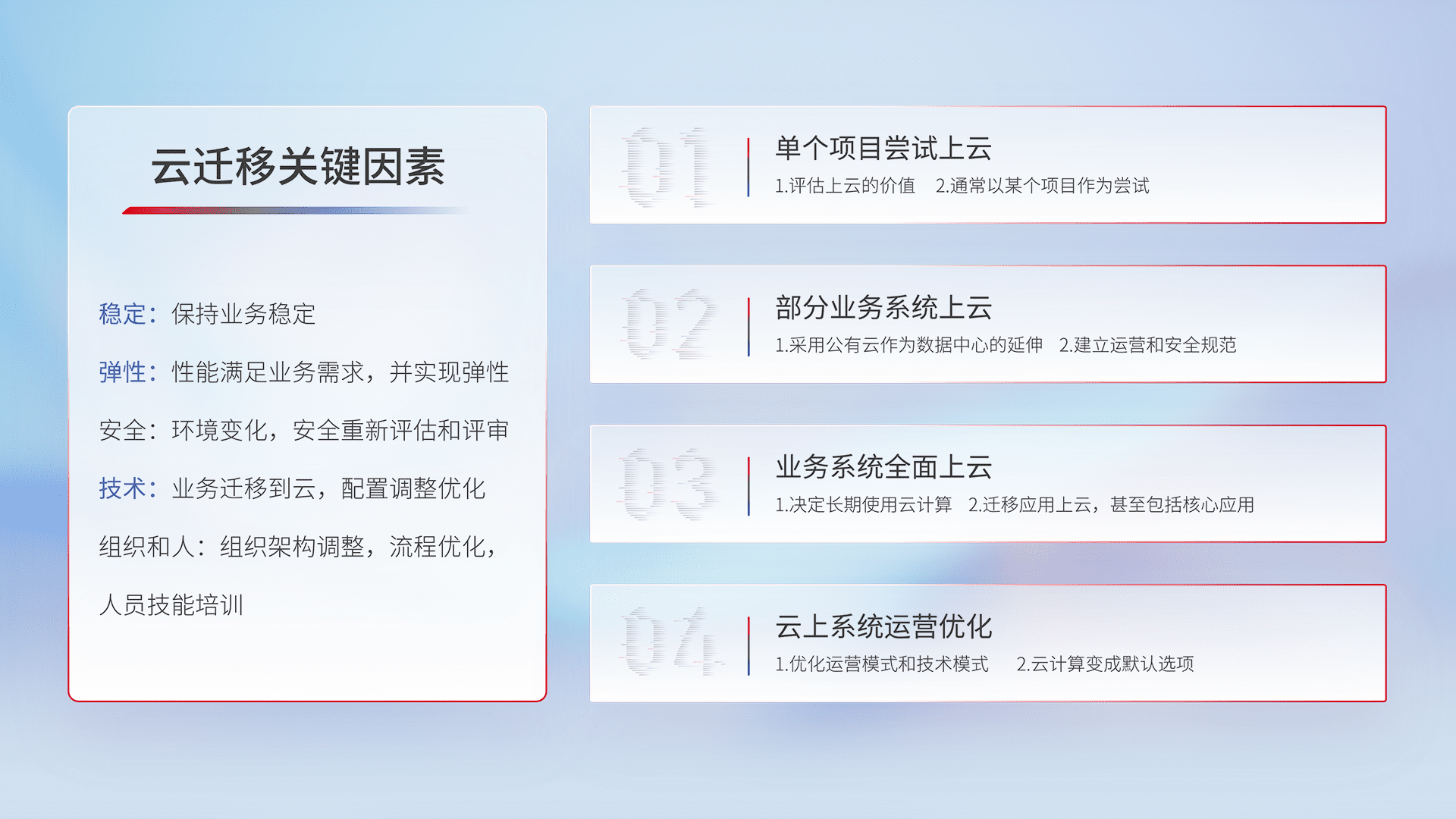 结合实际业务,,,从规划设计、、、云平台选型、、、云原生改造、、、数据迁移、、、、集成交付,,,迁移全过程为客户识别最佳上云路径,,,做好风险识别管理,,,,设计网络架构、、、身份权限、、、安全审计合规、、操作审计、、、日志审计、、、、监控告警策略、、多站点容灾设计等,,对云上基础设施进行整体规划,,提升IT治理水平,,,以满足弹性、、高可用、、高性能的需求。。。。