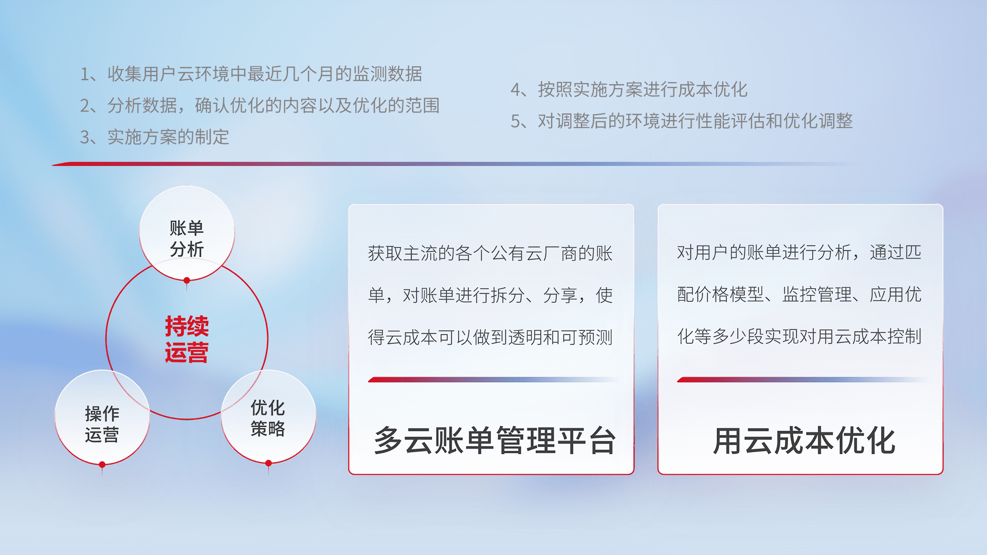 通过多云纳管,,,,以统一的资源数据模型把客户的云资源进行抽象和封装,,进而实现对多云资源的统一操作,,,,保障云资源管理的可靠性、、稳定性与可用性。。。。量身定制化运维内容,,,配置、、、、开发运维、、、补丁管理、、、备份、、、、监控、、认证和访问管理、、审计和日常巡检等,,,保障在用云过程中的可靠度,,稳定度以及高可用率。。。。